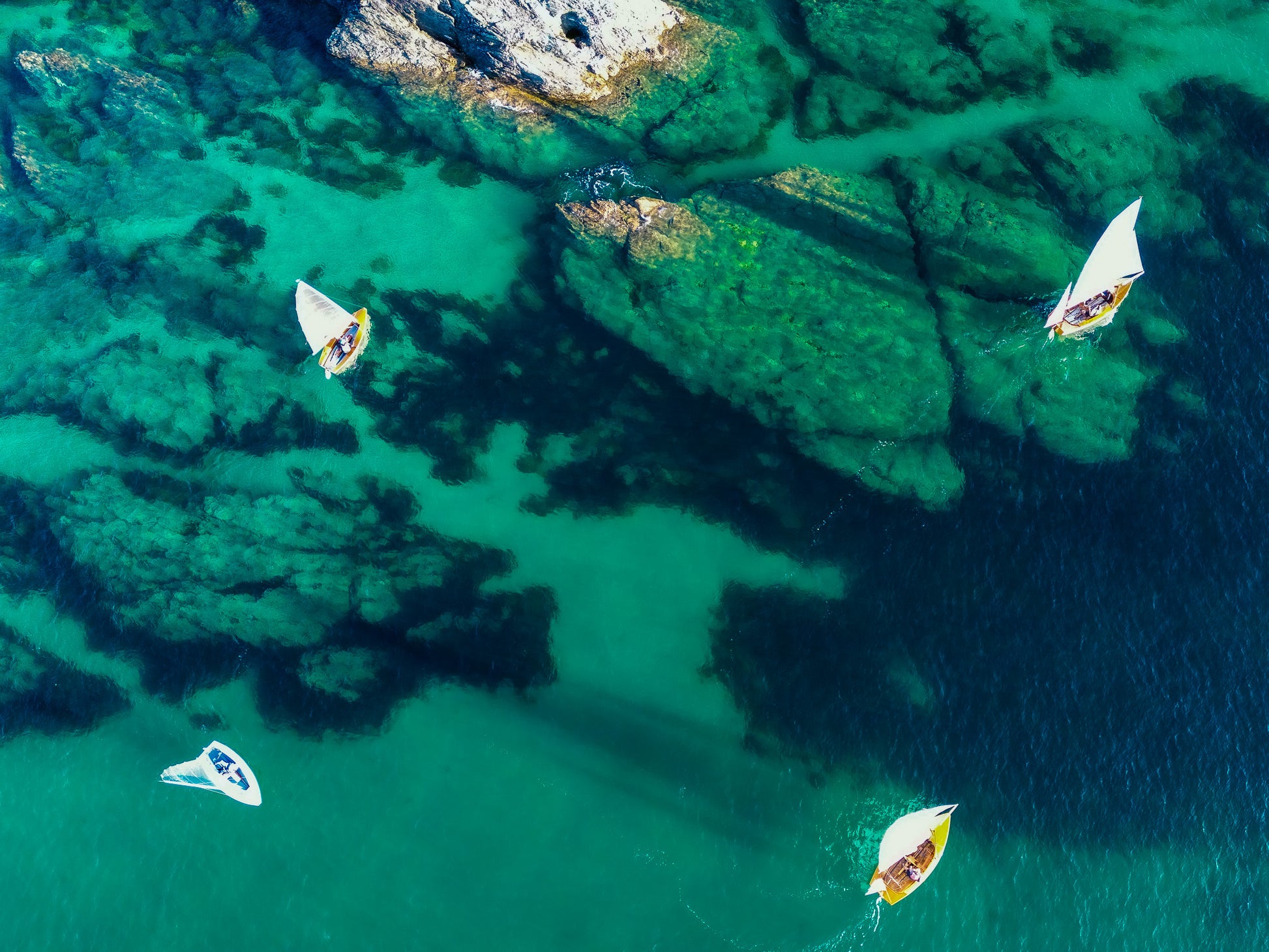 The composition exudes a sense of tranquillity and adventure, as the sails catch the golden sunlight, creating a play of shadows that adds depth and drama to the scene. The tactile positioning of the Salcombe Yawl's and Solo dinghies against the textured rocks forms a visual symphony, highlighting the harmony between nature and human activity.