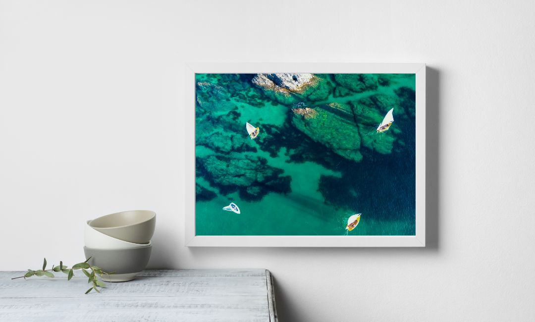 Printed on high-quality gloss paper, the colours are rendered with precision, bringing to life the vibrant hues of the sailboats and the rich textures of the coastal landscape. The carefully chosen frame complements the image, adding a touch of sophistication and making it ready to be showcased in any discerning space.