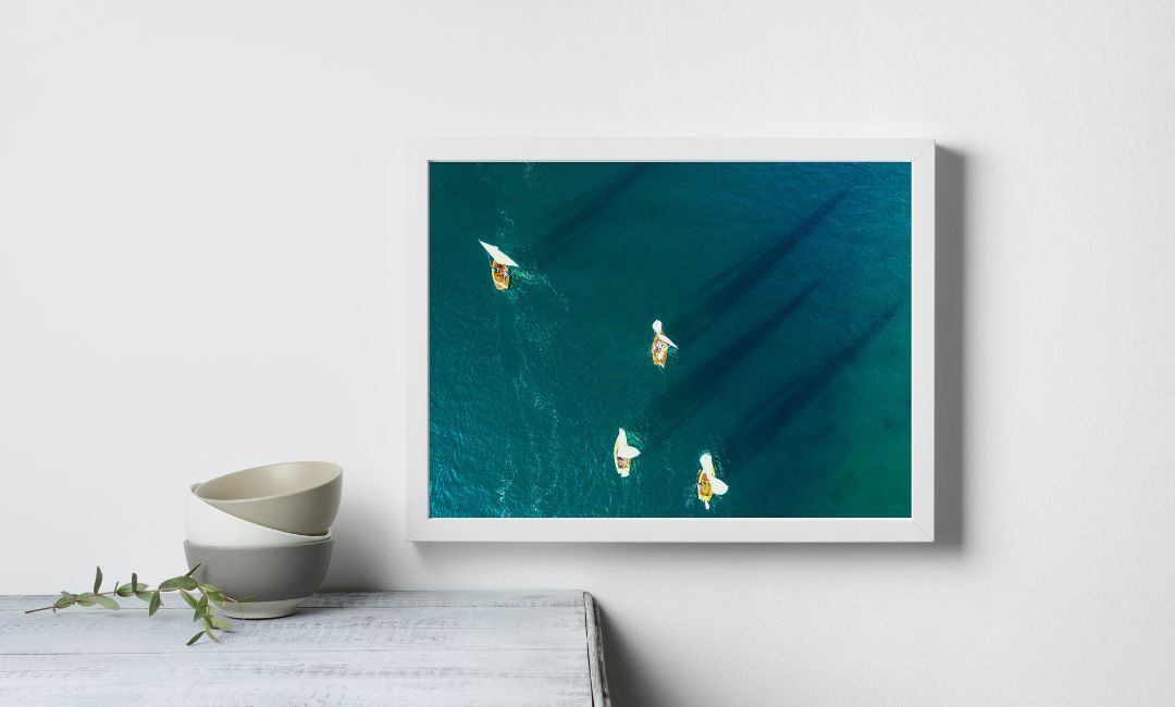 Printed on high-quality gloss paper, the colours are rendered with precision, bringing to life the vibrant hues of the sailboats and the rich textures of the coastal landscape. A carefully chosen frame would complement the image, adding a touch of sophistication and making it ready to be showcased in any discerning space.