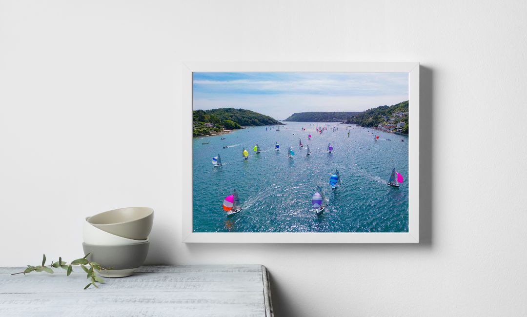 Printed on high-quality gloss paper, the print faithfully reproduces the vibrant colours of the spinnakers and the natural beauty of the Salcombe Ria. A carefully chosen frame adds a touch of sophistication, ensuring that this piece becomes a stunning focal point in any space.