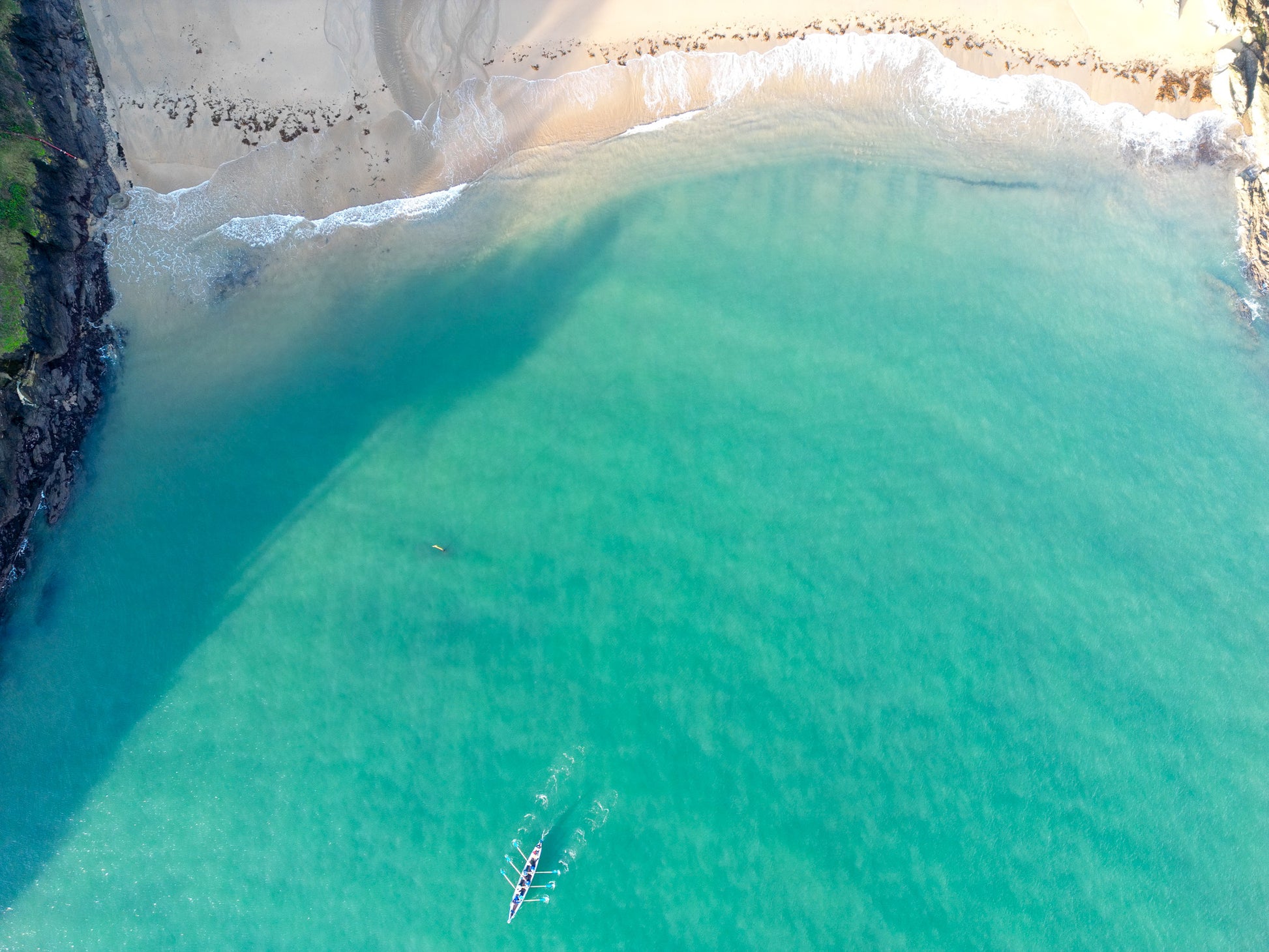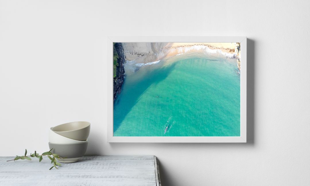 Introducing our captivating aerial print, showcasing a mesmerising birds-eye view of a Cornish Pilot Gig gracefully navigating the pristine waters of South Sands in Salcombe.