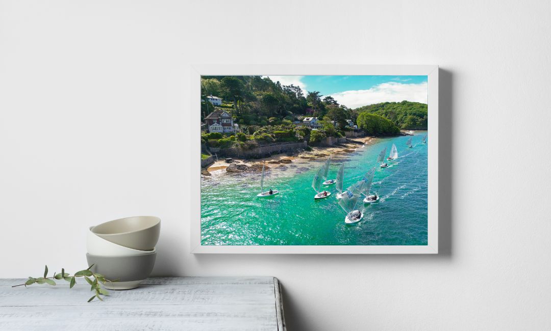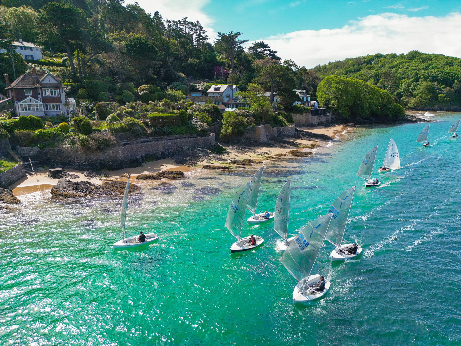 Solo dinghies racing downwind, escaping the tide by hugging the shore.