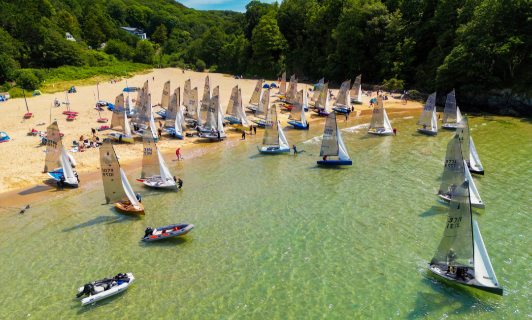 Merlin Rockets launching at Mill Bay during Merlin Rocket Week 2023.
