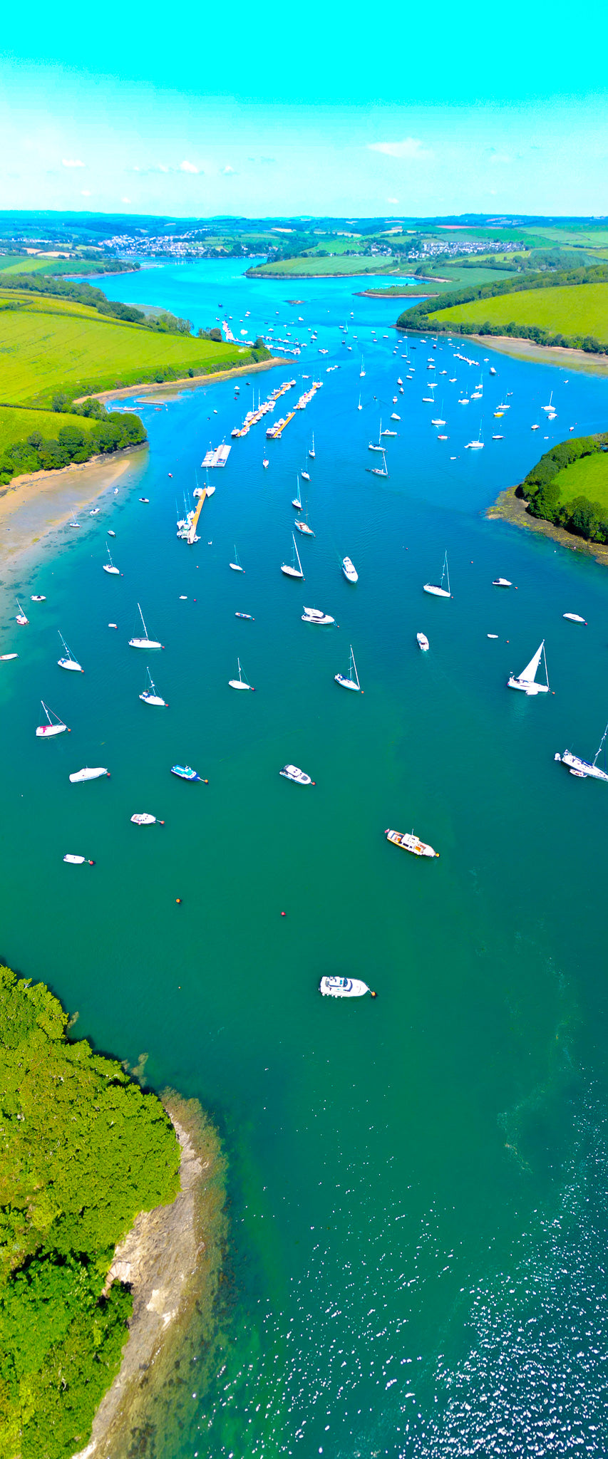 The careful framing enhances the visual impact, drawing attention to the intricate details of the town's harbour, colourful boats bobbing gently in the water, and the idyllic shoreline. The panoramic format adds a cinematic quality, inviting viewers to step into the scene and experience the tranquillity of Salcombe first-hand.